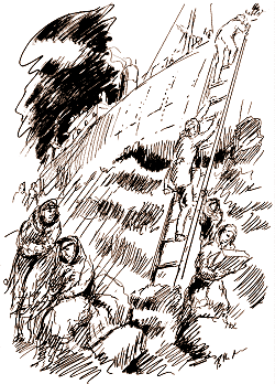 The castaways set off along the intricate passages to Charlton Island. Gillies provided two Hudson's Bay Company pilots, three lighters and some food. The pilots led the way in two lighters, Captain Berry came next in command of a sailing lighter, then followed the ship's two lifeboats. As George Venables recalled: