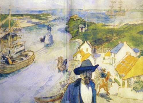 "When I look at my brothers picture, Memory Harbour.. houses and anchored ship and distant light-house all set close together as in some old map.. I recognize in the blue-coated man with the mass of white shirt the pilot I went fishing with, and I am full of disquiet and of excitement, and I am melancholy because I have not made more and better verses. I have walked on Sinbads yellow shore and never shall an-others hit my fancy".